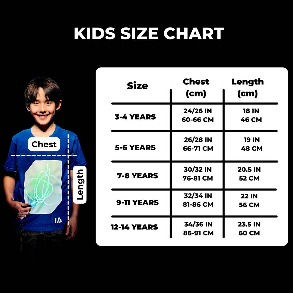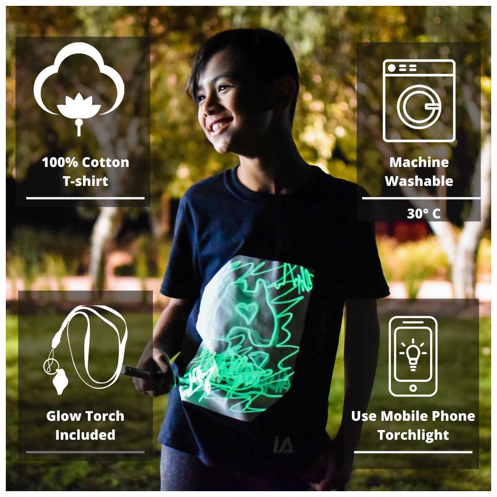 Δημιουργήστε, ζωγραφίστε και φωτίστε τη φαντασία σας με το Glow In The Dark T-Shirt. Χρησιμοποιήστε το επαναφορτιζόμενο Glow Pen (περιλαμβάνεται) ή το φως από το κινητό σας για να σχεδιάσετε επάνω στη μπλούζα — ξανά και ξανά! Τα σχέδιά σας διαρκούν έως και 5 λεπτά πριν σβήσουν, έτοιμα για νέες δημιουργίες. Κατασκευασμένη από 100% βαμβάκι και πλενόμενη στο πλυντήριο, συνδυάζει διασκέδαση, άνεση και καινοτομία.